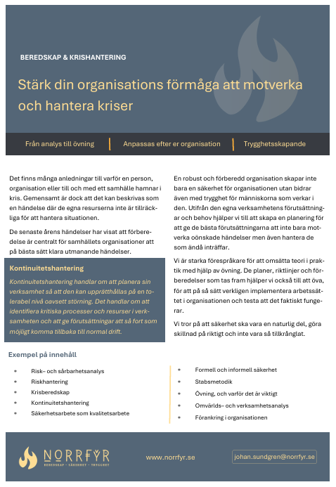 Norrfyr kan bistå med att ta fram kontinuitetsplaner för hur er verksamhet skall bedrivas i kris, implementera ledningssystem, hjälpa till med beredskapsplanering eller övningar i riskhantering och krisledning.